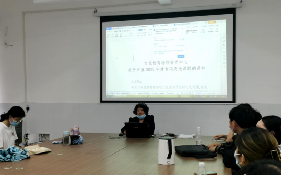 会议开始,美术学院研究生办主任龙社勤老师向同学们解读《文化教育场馆管理中心2022年度专项委托课题》文件,讲解我校文化场馆特征以及本次课题的重要性,并且根据选题申报指南引导同学们如何结合自己专业进行选题,动员和鼓励同学们积极参加此次课题申报,促进自我发展,在研期间不负青春,不负韶华。