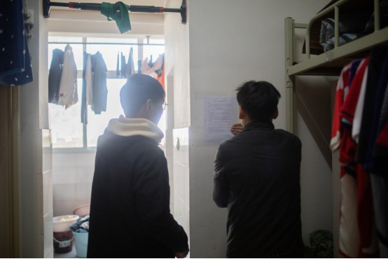 (图为 男生寝室张贴“敲门行动”消防安全告知书)