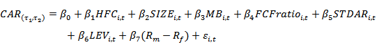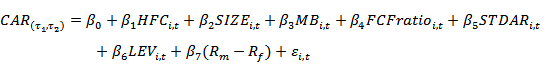 其中,CAR表示累计差额收益率,FC表示财务约束,SIZE表示公司规模,MB表示市场净值,STDAR表示信息不对称程度,LEV表示财务杠杆,Rm_Rf表示风险收益率。