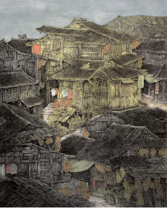 (图为硕士生导师向妤的水彩作品《聚变.湘西村寨》)