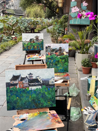 在一周的时间里,毛光辉将课堂搬到了湘西的乡村、山野,引导学生们不仅在千年古城的石板街巷、吊脚楼前,苗寨特色民居以及乡村的田园风光中寻找灵感,还强调关注湘西的自然景观和人文景观,以及乡村振兴带来的发展变化。他鼓励学生们用画笔去表现湘西的美丽风光,同时也要注重挖掘乡村的文化内涵和历史传承。学生们通过实地观察和体验,不断完善观察物象、取景构图、造型表现等,逐渐掌握了户外写生的方法和技巧,用画笔记录下湘西的自然风光和美丽乡村的点点滴滴。