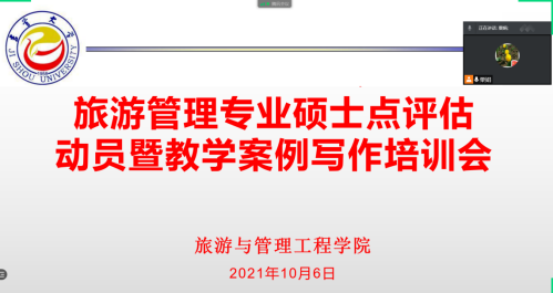 10月6日,旅游与管理工程学院召开旅游管理专业硕士点评估动员暨教学案例写作培训会,会议由粟娟副院长主持,鲁明勇院长、MTA全体导师、学生和部分校外兼职导师共60余人参会,由覃雯老师主讲,以腾讯会议线上方式召开。
