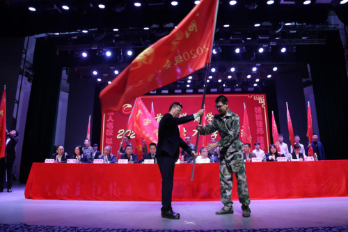 在授班旗仪式上,商学院院长丁建军在庄严的校歌声中为新增班级授予了班旗。当看到本班班旗在舞台上飘扬,在场的所有学生都非常激动,感觉自己真正地融入了一个新的集体之中,现场气氛十分热烈。相信学院“精诚锤炼,诠释商道”的院训已经深深地刻入新生的脑海中,他们一定会时刻铭记以班集体为荣、以学院为荣、以学校为荣。