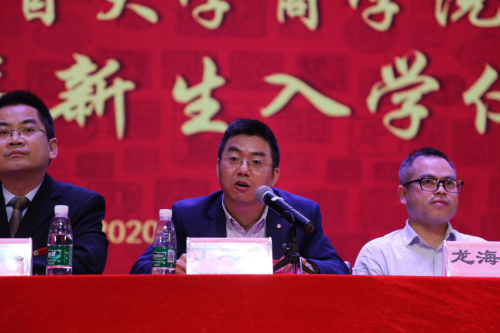 10月11日上午,商学院在砂子坳校区实验剧场隆重举行2020年新生入学仪式。院长丁建军,院党委副书记胡锦湘,副院长龙海军、张琰飞,院党建工作组织员黎克双,院学术委员会主席、校友分会会长钟高峥,学院MPAcc教育中心主任游新彩,经济系主任李琼,工商管理系主任张怀英,国际经济与贸易系主任于正东,会计系主任张霞出席仪式并在主席台就坐,学院办公室主任、各年级辅导员、各新生班级班主任也出席了仪式。仪式由院党委副书记胡锦湘主持。