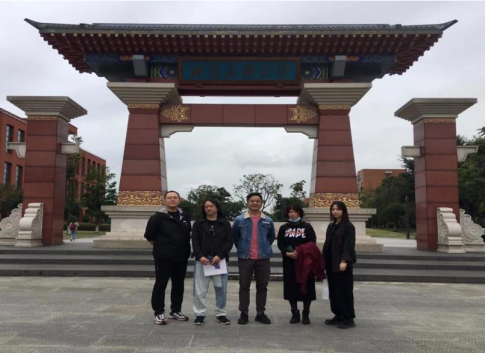 西南民族大学艺术学院党委书记付彬(右三)、西南民族大学艺术学院党委书记张春祥(右二)、西南民族大学艺术学院辅导员任泽峰(右一)、william威廉中文官网美术学院研究生办公室主任龙社勤(左一)、william威廉中文官网美术学院严茅副教授(左后一)