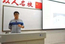 刘志勇博士讲述了“杜仲胶医用形状记忆聚合物的合成与研究”,报告了自己对杜仲胶材料的研究以及通过仿真和实验取得的一些结果。他用通俗易懂的讲解方式,让在座的师生了解了形状记忆聚合物以及以杜仲胶为基体的形状记忆材料在生活中的一些应用。