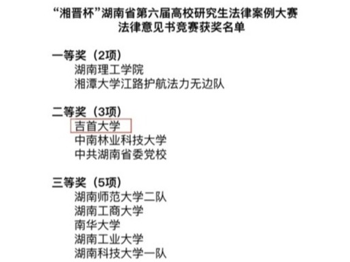 此次比赛共有中南大学、湖南大学、湖南师范大学、湘潭大学等省内13所高校18支队伍参赛,我校参赛队伍由法学与公共管理学院党委书记彭献忠带队,副院长郑牧民、杨佶老师训练指导。经过激烈的比赛,我校荣获湖南省第六届高校研究生法律案例大赛法律意见书竞赛二等奖,孙立昌同学荣获“优秀辩手”称号。