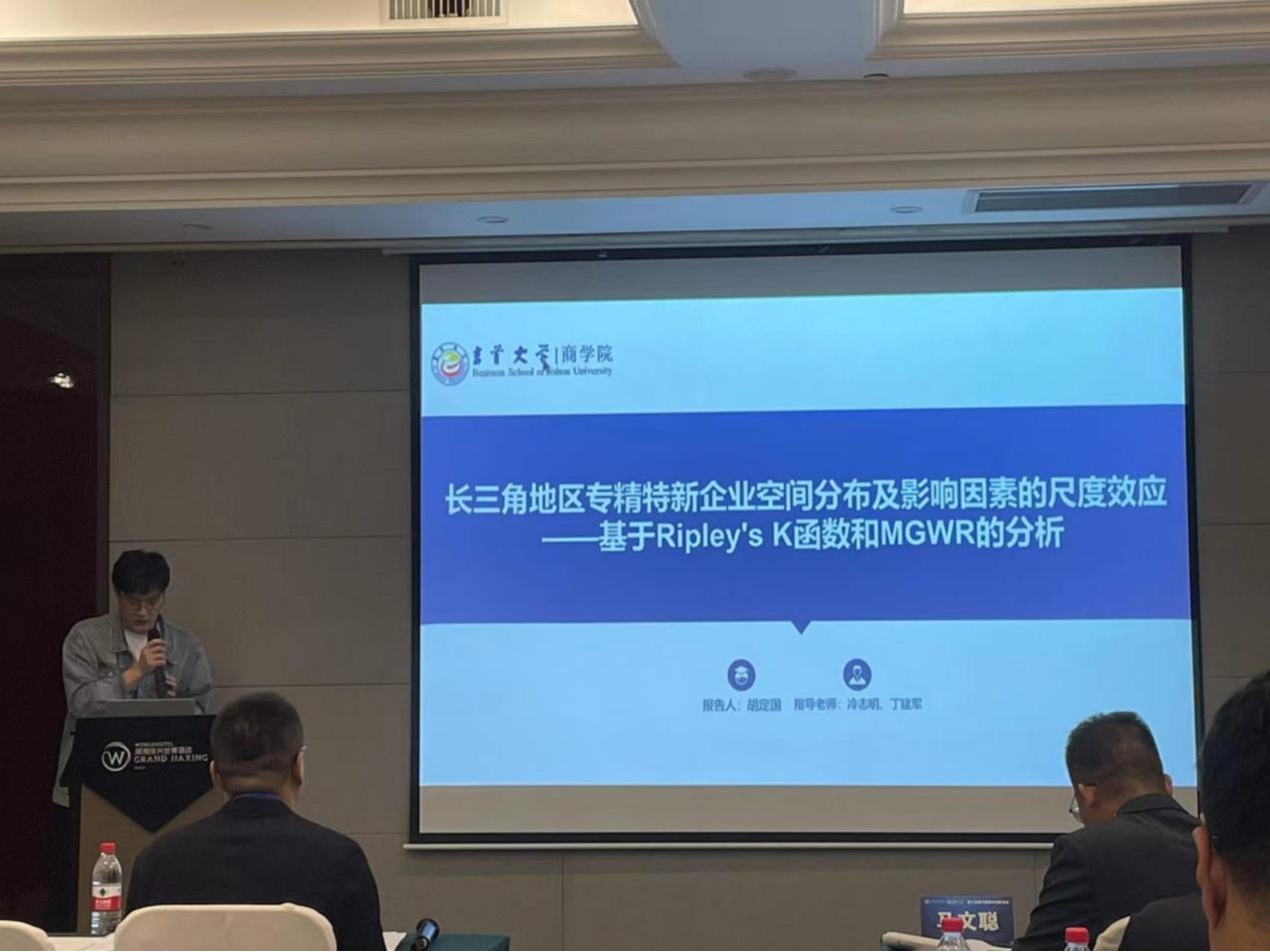 胡定国汇报题目为《长三角地区专精特新企业空间分布及影响因素的尺度效应——基于缓冲区与MGWR的分析》,主要汇报内容为:高质量培育专精特新企业是夯实我国产业链供应链安全基础的重要抓手。运用缓冲区分析和多尺度地理加权回归模型(MGWR)探究长三角地区专精特新企业空间分布及影响因素的尺度效应,发现:(1)空间上,上海是专精特新企业集聚的首位地区,其次是省会城市和沿江沿海城市;行业构成整体上呈“非均衡”态势,机械设备制造业与高新技术制造业等实体经济行业占比较高,但不同区域有差异。(2)集聚上,圈层差异和尺度效应明显。距上海市政府驻地越远的地区专精特新企业数量总体趋向减少,但先后出现了5个波峰和2个主要集聚区、2个次级集聚区,450km之后则呈随机零散分布。(3)专精特新企业分布影响因素的作用具有空间异质性,土地利用与要素流动的作用尺度较小,是局部变量,对不同地区专精特新企业空间分布的影响差异较大;海拔高程、数字基建、市场化程度、外贸依存度和政府干预度等因素的作用尺度较大,是全局变量,并且除市场化程度、外贸依存度对专精特新企业空间分布有显著的负向影响外,其余因素对专精特新企业空间分布的影响都显著为正。