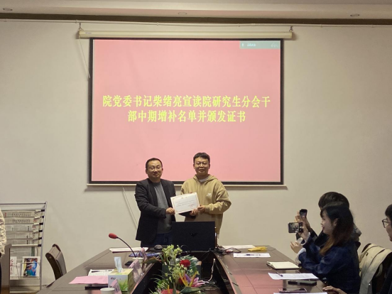 随后各部长分别对所在部门过去一年的工作进行了总结与反思。柴绪亮宣布了研会干部中期增补名单,并对优秀干部与三好学生获奖者进行了表彰。