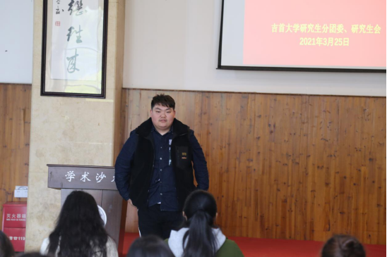 发言、探讨环节研究分团委学生副书记杨丹表示作为新时代的硕士研究生,我们既要缅怀先辈的光辉业绩,发扬党的优良传统,优良作风更要时刻牢记学生干部所肩负的责任,清醒认识我们面临的形势和任务组织部刘造表示我们都应该明白我们现在拥有的美好生活都是无数革命前辈们用他们的鲜血换来的作为青年的我们,更应该要多多学习党史,做到不忘历史,不忘初心,努力奋斗,砥砺前行组织部成员赵媛渊分享了湖南澧县左权将军的故事,她表示,革命的红色火炬经过一代又一代人的传递,已经到了我们手上,恰中国共产党成立100周年之际,希望大家共同学习,砥砺前行,肩负起时代赋予我们的任务和使命生活部银帆对工人运动的相关历史进行介绍宣传部代表雷朝文以“党史”、“新中国史”、“改革开放史”、“社会主义发展史”“四史”为主题进行发言,讲述如何学习四史学习四史的重要性等内容
