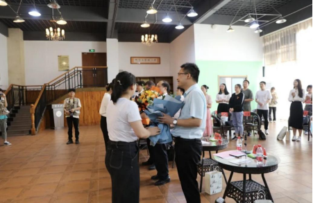座谈会尾声,毕业生代表向三位领导献花。全体起立,齐唱校歌《凤飞千仞万里鹏程》。