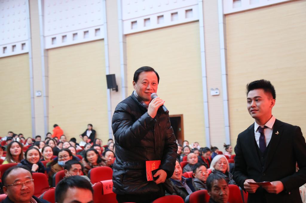本网讯(李飞 宋林凤)12月27日晚,我院2018年“不忘初心,圆梦吉大”研究生院元旦晚会在砂子坳音舞演奏厅隆重举行。校长白晋湘、副校长钟海平、龙先琼;湘西州州委常委、吉首军分区司令员刘长进、我国著名艺术家毛光辉、湘西州人大常委会副主任宛庆丰、湘西州文广新局副局长高振翼、湘西州科技局副局长翁立志、湖南日报记者杨元崇先生及研究生院、各职能部门相关负责人出席本次晚会,与我校研究生共聚一堂,辞别旧岁,进行新年展望,共同感受属于研究生院的精神风貌。