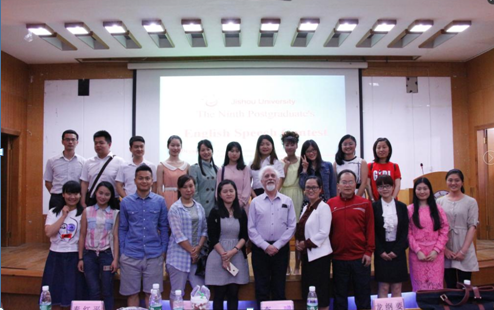 本网讯(学生记者杨思逸)5月17日晚,我校第九届研究生英语演讲比赛决赛在图书馆学术报告厅举行。我校副校长李定珍、研究生处副处长李长友、国际交流与公共外语教育学院(以下称国交学院)副院长刘汝荣出席比赛。外教John以及国交学院部分专业老师担任评委。