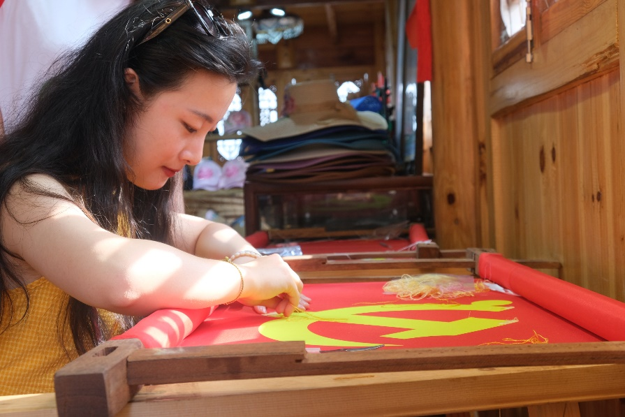 (实践团成员学刺苗绣“共绣一面党旗”)