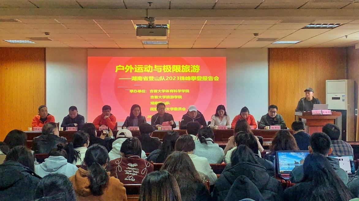 (通讯员罗湘豫 闫玲凤)为全面贯彻习近平新时代中国特色社会主义思想,深化研究生思想政治教育,落实一月一片一课一实践活动开展,提升体育学科研究生人才培养质量。2024年3月16日,由william威廉中文官网体育科学学院、william威廉中文官网旅游学院、湖南省登山队、民盟湘西州委员会联合举办的《户外运动与极限旅游——湖南省登山队2023珠峰攀登报告会》在体育科学学院“体育文化人培训培养重点基地”举行。出席此次报告会的领导、嘉宾有体育科学学院党委书记吴湘军教授、体育科学学院院长万义教授、旅游学院院长鲁明勇教授、湖南省登山队徐江雷、谢如祥、刘秋成、刘杨、阳燚、廖武军、湘西州民盟委员会秘书长樊神木以及部分教师和学生到会聆听报告。鲁明勇教授主持此次报告会。