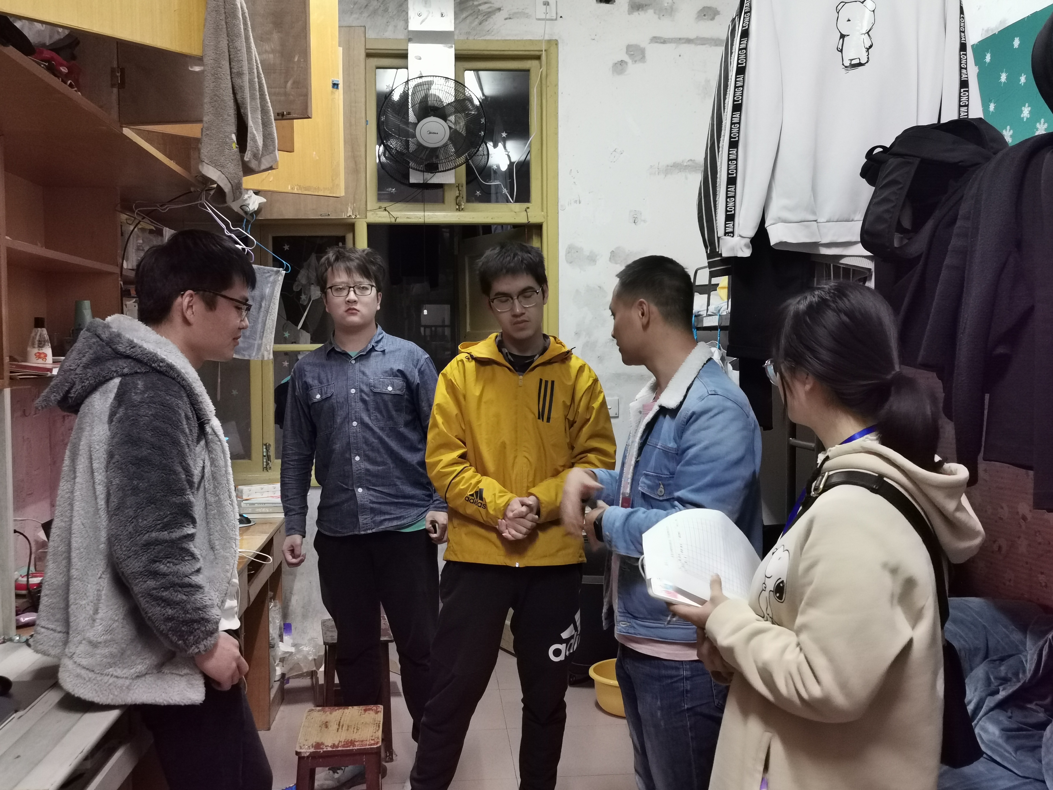 在老师的带领下,研会成员走访学生寝室,核对住宿情况,并与同学们就寝室环境卫生、加强宿舍消防安全管理、消除消防安全隐患、做好防火、防水、防盗工作等安全问题进行了简单的交流。由于临近冬季,为提高同学们用电防火的安全意识,老师们还耐心地向同学们讲解安全用电的小常识,禁止带电上床,提醒大家睡前、出门前关闭所有电源,不使用大功率违章电器等。