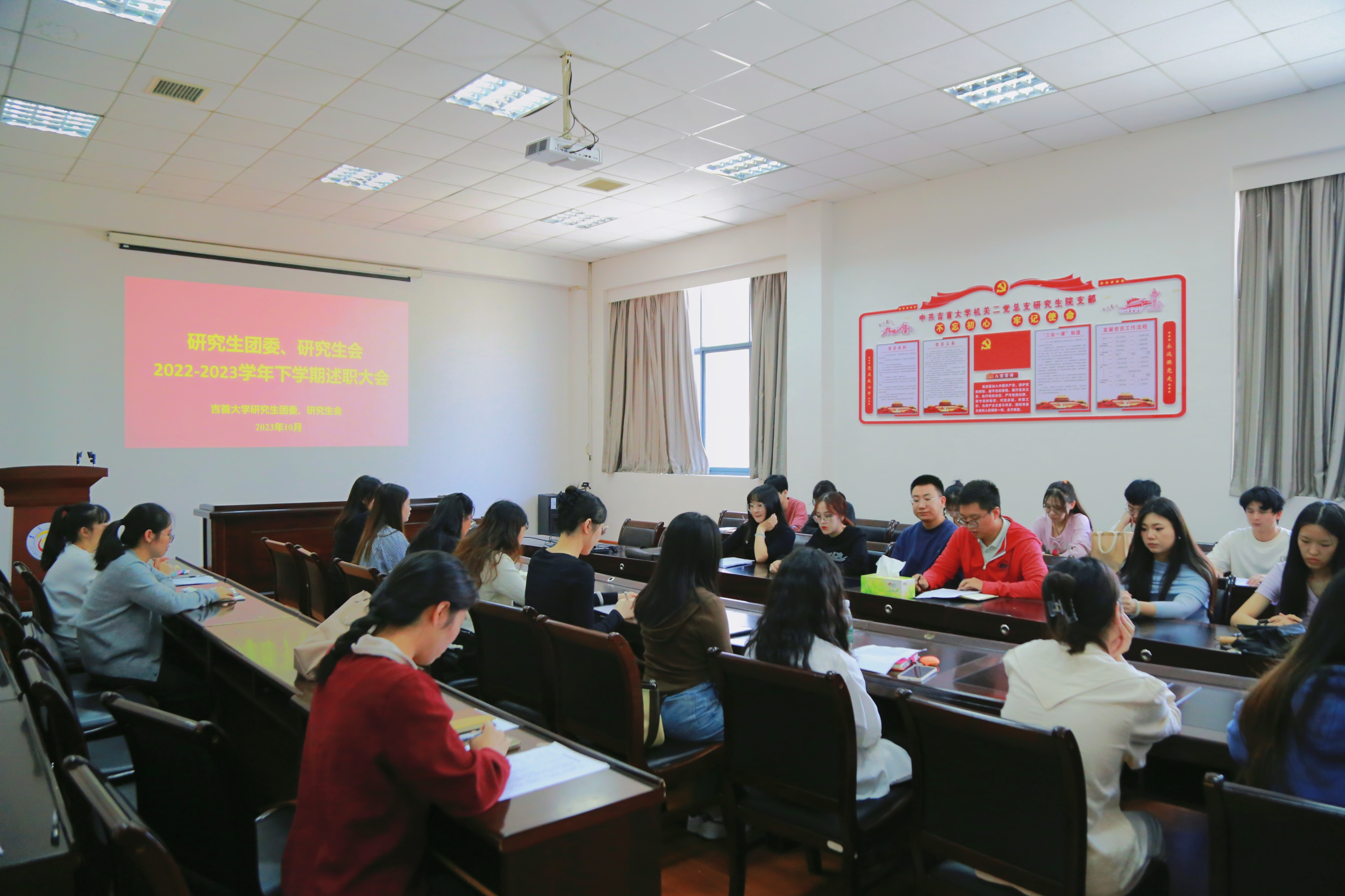大会分为三项。首先,研究生会主席团成员和团委副书记就各自分管领域的工作情况进行述职汇报。汇报重点回顾了上学期工作取得的实绩与成效,总结了工作中的经验做法和不足之处,并对下一阶段的工作进行了规划与展望。