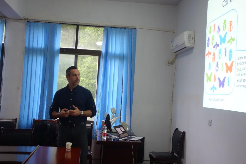 Marc Cadotte教授首先介绍了影响群落构建的两大因素:环境过滤和种间竞争。随后他结合自己多年的研究从时间演替和空间尺度上探讨了影响群落的内在机制,系统讲解了谱系多样性对于生态系统生产力、稳定性和可入侵性的影响,揭示了进化历史对于群落物种定殖、共存和灭绝的效应。最后,Marc Cadotte教授介绍了他的研究团队,他表明他对武陵山区的植被群落兴趣浓厚,希望加强多伦多大学与我校的学术交流。(文/杨胜香)